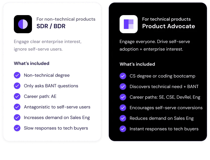 When signals are hot, reps show up as peers with context. In devtools for instance, AEs act like product advocates, not closers.